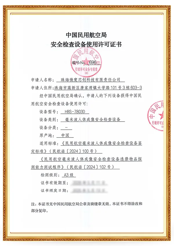 Микроволновой сканер безопасности HBS-7803 может быть дооснащен опциональным модулем обнаружения металлических предметов в обуви, расширяя зону досмотра. Кроме этого, наш сканер имеет сертификат уровня A3 от Управления гражданской авиации Китая (CAAC) на применение досмотрового оборудования в аэропортах и других доступных пространствах.